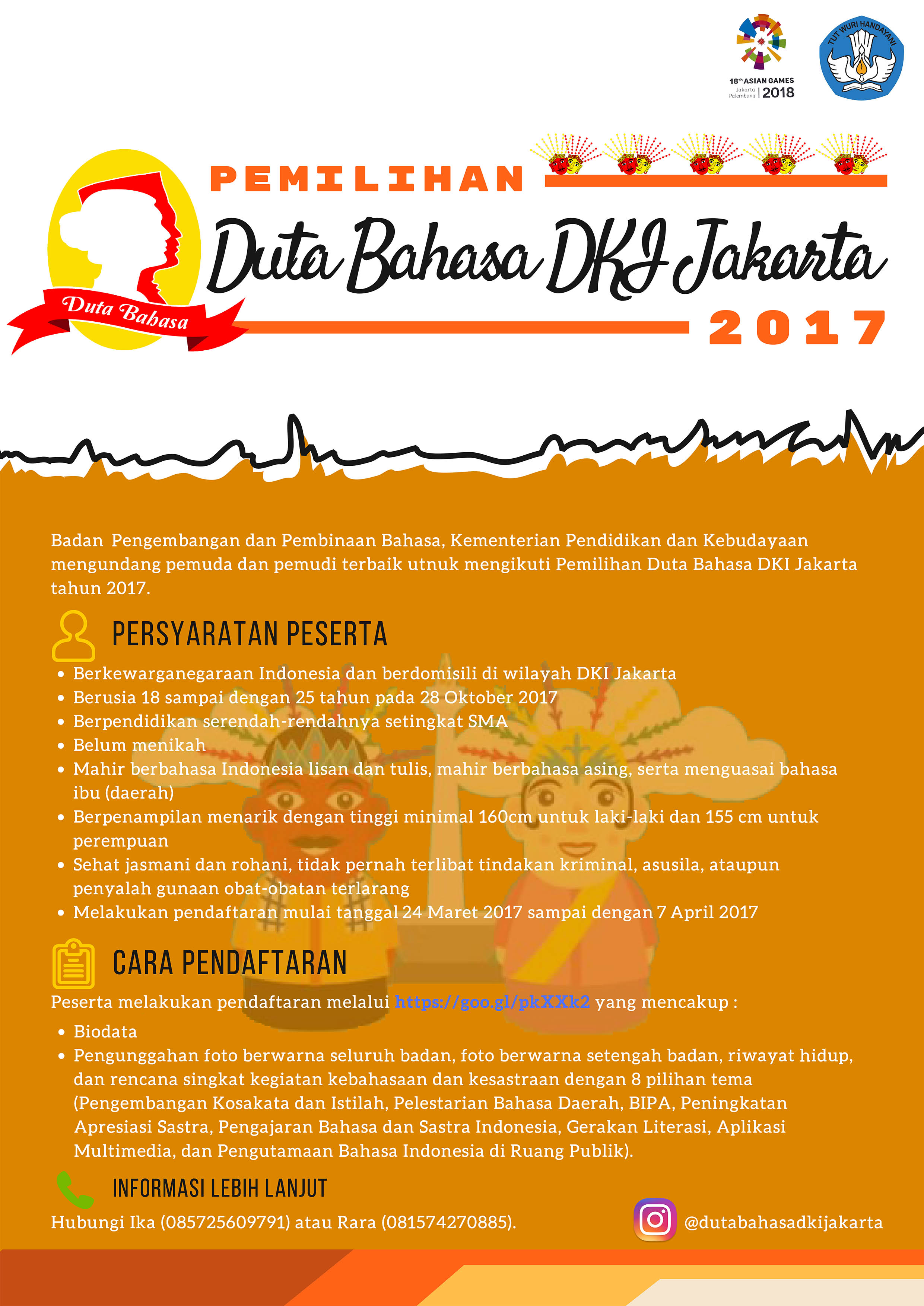 Badan Pengembangan dan Pembinaan Bahasa, Kementerian Pendidikan dan Kebudayaan mengundang pemuda dan pemudi terbaik untuk mengikuti Pemilihan Duta Bahasa DKI Jakarta tahun 2017.