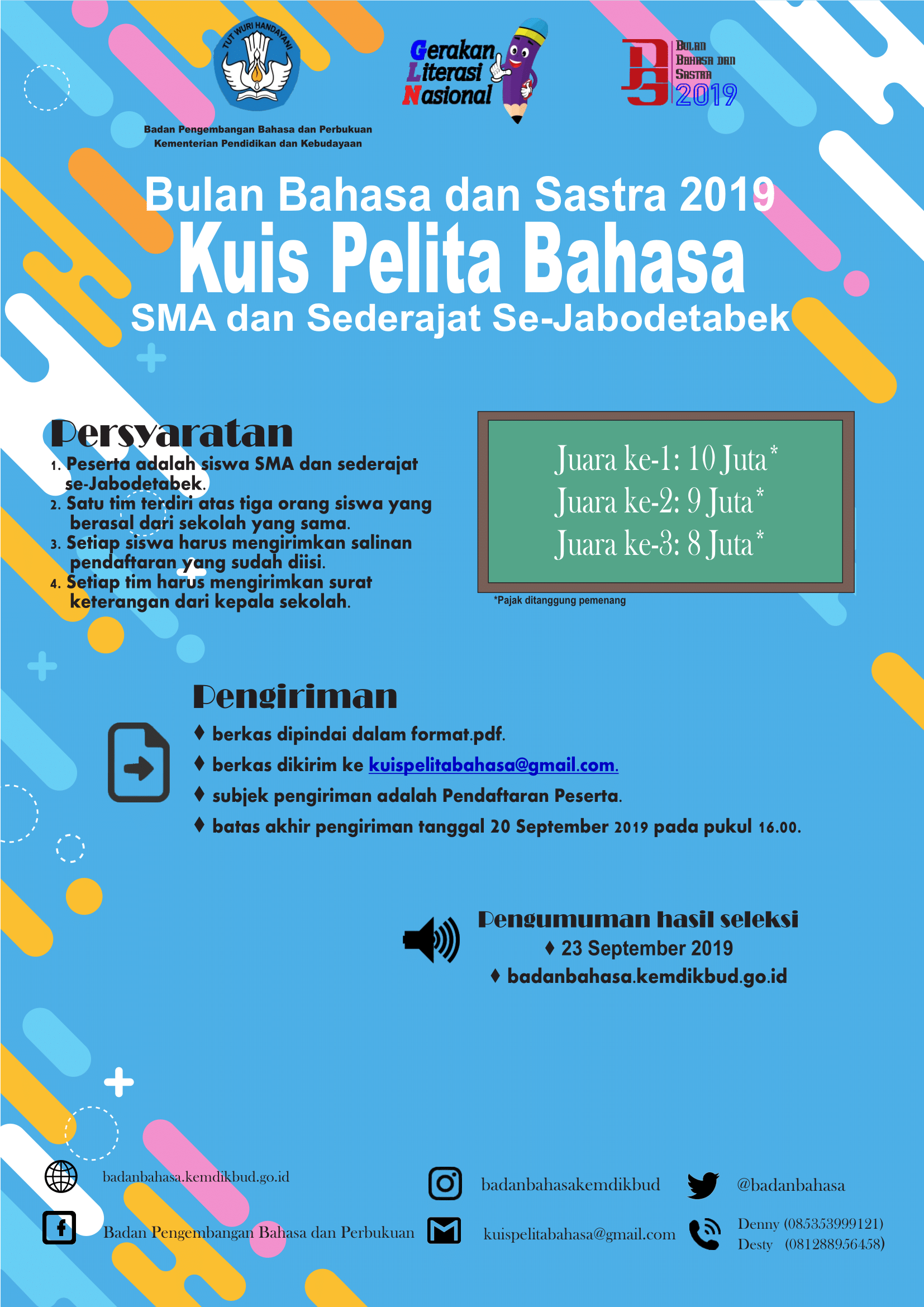 Dalam rangka menyambut Bulan Bahasa dan Satra 2019, Badan Pengembangan Bahasa dan Perbukuan melalui Pusat Pembinaan Bahasa dan Sastra menyelenggarakan Kuis Pelita Bahasa dan Sastra Tingkat SMA dan Sederajat Se-Jabodetabek. Informasi dan formulir pendaftararan terdapat pada lampiran di bawah ini.