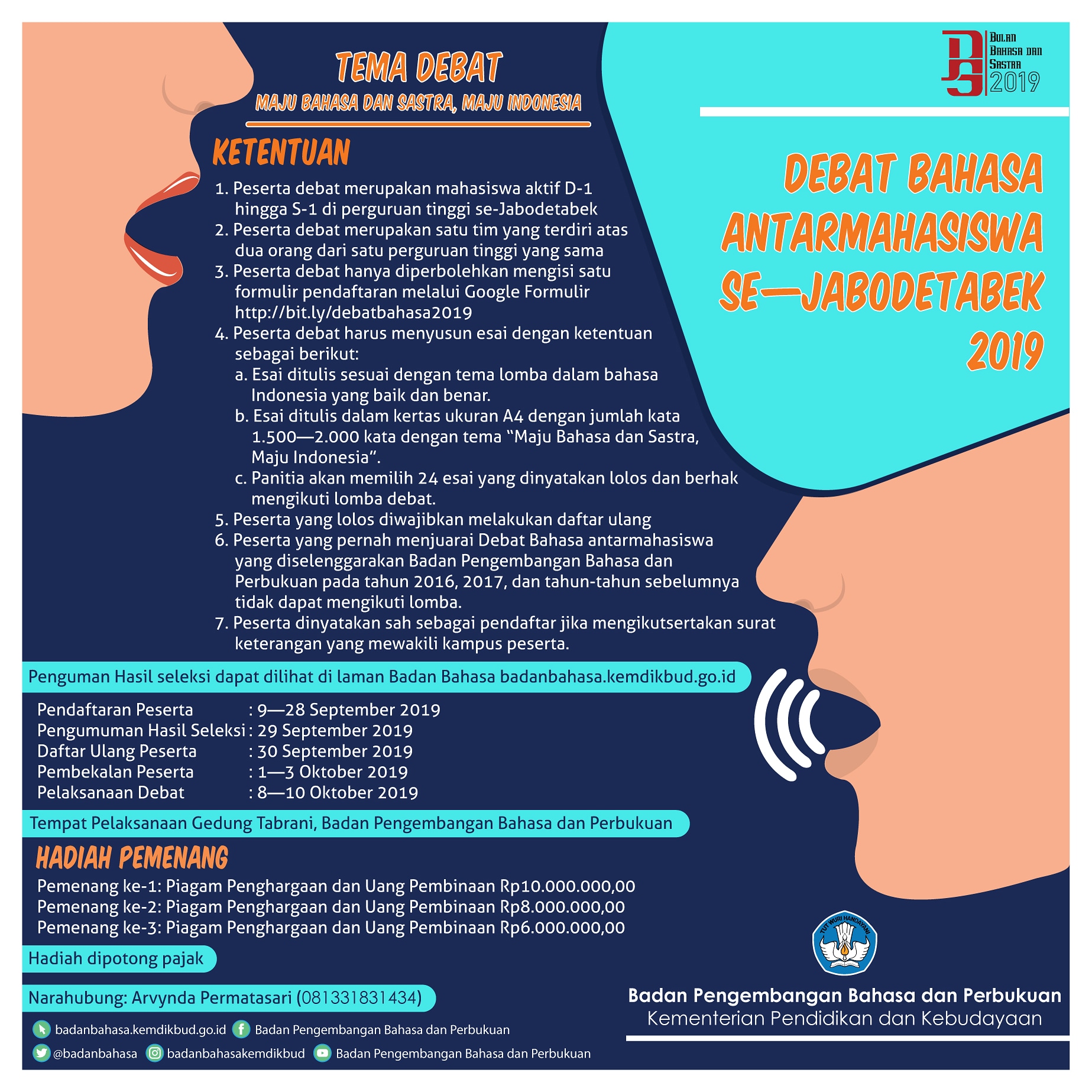 Dalam rangka Bulan Bahasa dan Sastra Tahun 2019, Badan Pengembangan Bahasa dan Perbukuan mengadakan Lomba Debat Bahasa Antarmahasiswa Se-Jabodetabek Tahun 2019. Peserta yang dapat berpartisipasi adalah mahasiswa aktif jenjang D-1 hingga S-1. Total hadiah Rp24.000.000,00 (potong pajak). Jaga bahasa negara, rekat kebinekaan!